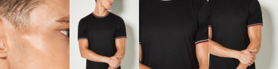 65% polyester/35% cotton. 1x1 folded ribbed collar and cuffs with contrast tipping. Self fabric bound collar. Topstitched front neck. Twin needle hem. Tear out label.