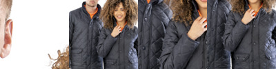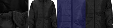 Polyester outer. Polyester padding and polyester taffeta lining. Twin needle quilting design. Showerproof and windproof. Stand up collar. Collar high full length zip with inner zip guard. Front and inner zip pockets. Adjustable drawcord hem. Cut out label. Access for decoration.