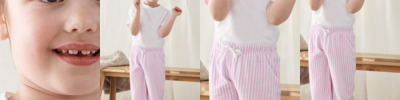 95% polyester/5% elastane. Shirt with notched collar. Self colour pearlised plastic buttons. Contrast piping around collar and centre front opening. Self fabric cuffs with contrast piping. Trousers have elasticated waistband with mock white drawcord. Contrast piping on leg ends. Twin needle hems. Tag free.