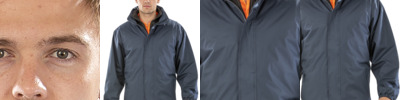 190T polyester pongee outer with StormDri 2000 coating. Polyester mesh lined body and polyester lined sleeves. Outer jacket is waterproof 2000mm with taped seams. Windproof. Concealed adjustable hood. Collar high full length zip with tear release storm flap. Inner pocket. Two front pockets. Elasticated cuffs. Access for decoration. Removable 210T polyester diamond quilted bodywarmer. Showerproof. Collar high zip. Two front pockets. Inner pocket and side vents. Cut out label.