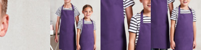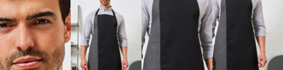 65% polyester/35% cotton twill. Easy care fabric. 1/3 contrast panel. Self fabric neckband with sliding, adjustable buckle. Two side pockets with slanted entry. Self fabric 90cm ties. Width 72cm. Length 86cm. Industrial laundry 85°C. Domestic wash 60°C.