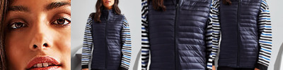 Contrast coil zip on centre front with signature zip puller and mouse tail piping on each side of zip opening. Front and back square stitched baffles with linear side narrow baffles. 250gsm lightweight polyester fill. Fully-lined in tonal polyester. Inset welt pocket with concealed zip opening and double zip garages. Contrast stretch binding on hem, cuffs and hood opening for added protection. Internal piping around inside facing. Secure hood attached to collar. Internal zipped opening on back panel for embroidery access. Internal welt pocket. Product contains no branded neck label.* Removable Kimble or looped garment tags. Inner seam label holds important product information on one label with a second label containing brand information which can be cut-away.