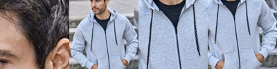 70% ringspun cotton/30% polyester. Brushed back fleece. Raglan sleeves. Fitted style. Two panel lined hood. Contrast striped drawcord with branded eyelets. Full length zip. Front pouch pockets. Ribbed cuffs and hem with elastane.