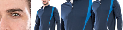 100% polyester. Cool-Dry© mesh panels. Breathable. Fabric is moisture wicking and quick dry. Mandarin collar. Zip neck with chin guard and inner zip guard. Contrast panel detail on front and back. Contrast print on sleeves. Cover stitching.
