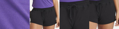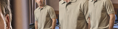 100% textured polyester. Cooltex® Plus wicking yarn. 1x1 ribbed collar. Self fabric taped neck and shoulders. Topstitched front collar. Twin needle sleeves and hem. Removable adhesive neck label.
