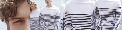 100% cotton single jersey. Regular fit. Stretch ribbed collar. V flatlock stitching detail at neckline. Flatlock stitching at neck, shoulder seams and armholes. High chest seam on front and upper arms. Striped lower body and sleeves. Plain upper body. Twin needle cuffs and hem. Tag free.