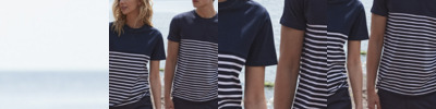 100% cotton single jersey. Ribbed stretch collar. Flatlock stitched V detail at front neckline. Flatlock stitched neckline, shoulders and armholes. Contrast taped neck. High chest seam. Contrast striped lower body. Side seams. Twin needle sleeves and hem. Tag free.