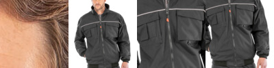 9 oz./yd² / 300 gsm, 96% polyester, 4% spandex bonded with brushed tricot with inner membrane; 3,000 mm waterproof rating; 1,000 g breathability rating; Matching chin guard; Center front revese coil zipper; Lower zippered pockets;