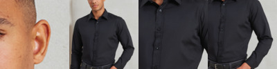 65% polyester/35% cotton poplin. Easy care fabric. Fitted style. Stiffened formal cut away collar. Two button adjustable cuffs with option for cuff links. Curved hem.