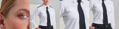 65% polyester/35% cotton poplin. Easy care fabric. Fitted style. Stiffened collar. Epaulette bars. Two chest pockets with button down flaps. Combined pen pocket on left chest pocket. Curved hem. Clip on cravat available PR711. Available in short sleeve PR312.