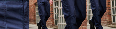 70% cotton/30% polyester. Easy care fabric. Contrast neckband with adjustable metal buckle. Contrast fabric ties with metal eyelets. Reverse contrast denim centre chest pocket and pen pocket. Lower front pocket and pen pocket. Width 72cm. Length 86cm. Industrial laundry 85°C. Domestic wash 60°C.