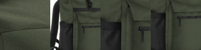 100% recycled 900D polyester/100% recycled 1680D polyester. Padded adjustable shoulder straps.Main compartment with roll-top closure.Rear padded laptop compartment, compatible up to 16".Front slip pocket with magnetic closure.Side pockets.Front zip pocket.PU zip pulls.Rear luggage strap.Tear out label.Capacity 22 litres.