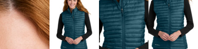 Designed with traditional quilt lines, this insulated vest is built for warmth and weather-resistant performance. Features include full-length interior storm flap with chin guard, exposed, molded zippers with Eddie Bauer logo pulls, zippered hand pockets and a slight drop tail hem. Includes a decoration access pocket. Packs into zippered left hand pocket. Contrast Eddie Bauer heat transfer logo on right hem. Made of 100% polyester ripstop and 3-ounce, 100% polyester blown fill. PU coating on back of shell. Durable water-repellent (DWR) finish.
