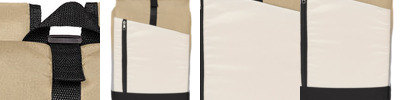 Roll top opening to large compartment with snap buckle closure; front vertical zippered pocket