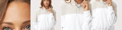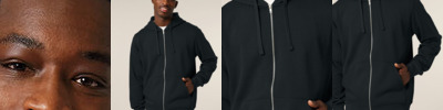 Set-in sleeves. Self-fabric lined hood. Flat drawcords in matching body colour. Embroidered buttonhole eyelets. 1x1 rib at sleeve cuffs and bottom hem. Kangaroo pocket with flatlock stitches. Exposed metal zip at centre front. Three-needle flatlock stitches on all seams. Herringbone tape at the inside back neck seam and inside of the zip. Self-fabric half moon at the back neck.