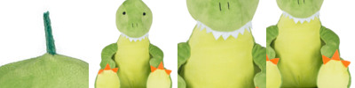 Green coloured Dinosaur. Contrast Felt decoration. Sewn eyes. Light green panel on chest and feet. Zip details on the base of the dinosaur for direct access onto the tummy for embroidery. Removable inner stuffing. Complies with EN71 European Toy Safety regulations. Remove all hang tags and their fasteners before giving these items to a child. Suitable for children of all ages.