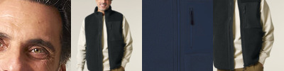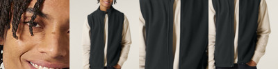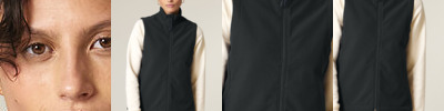 Sleeveless. Elastic recycled binding at cuffs and hem. Inside back neck binding loop and back neck tape. Plastic Vislon zip with metal zip pull and cord ends. Fully bonded inside polar fleece layer with anti-pilling finish. Front side contrast softshell welt pockets with hidden zip closure. Contrast softshell fabric at pocket, back yoke and outer collar band. Inside invisible zip at the wearer’s left chest for easy decoration.